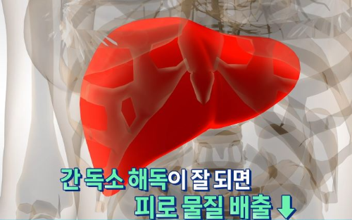 우리 몸에 있는 독소의 90%를 해독하는 기관이 바로 간입니다. 피로라는 것은 결국, 체내에 독소가 쌓여서 발생하는 것이기 때문에 간에서 독소 해독이 잘 되면 피로 물질 배출이 줄어들게 됩니다. 따라서, 간 독소 해독에 반드시 신경을 써야 합니다.