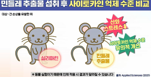 실제 간 손상을 유발한 쥐에게 7일간 레몬밤 민들레 추출물과 실리마린을 각각 섭취하게 하였더니, *실리마린 섭취군에 비해서 민들레 추출물을 섭취한 그룹이 산화스트레스가 감소하고, 사이토카인 억제 수준이 유의하게 개선됨이 확인되었습니다.