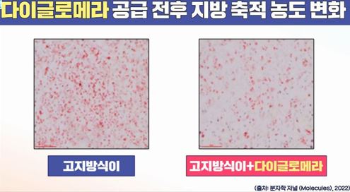 실제로, 한 동물실험에서 쥐에게 다이글로메라를 공급한 후 변화를 확인해 보았더니, 지방 축적 농도 감소에 도움이 되었다는 보고가 있습니다.