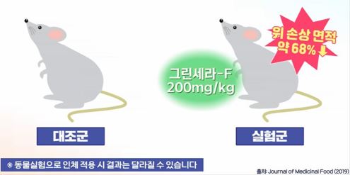 실제 한 동물 실험에서 위궤양을 유발한 쥐에게 그린세라-F를 투여한 결과, 대조군에 비해 위 점액량이 19% 증가한 것으로 확인되었습니다. 또한, 위 점막을 보호하는 프로스타글란딘 농도도 증가한 것으로 나타났습니다.
