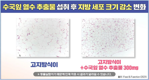 뱃살이 늘어나는 것은 지방 세포의 수가 많아지는 것이 아니라 지방 세포의 크기가 커지는 것으로, 뱃살을 빼려면 지방 세포의 크기를 줄이는 것이 중요합니다. 비만을 유발한 쥐를 나누어 한 그룹에는 고지방식이를, 다른 그룹에는 고지방식이와 수국잎 열수 추출물 300mg을 섭취하게 하였더니 대조군에 비해 지방 세포 크기가 감소한 것을 확인할 수 있었습니다.