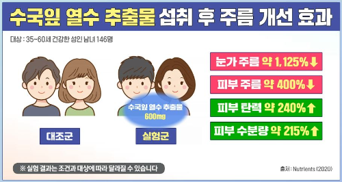 수국잎 열수 추출물피부 건강에 도움을 줄 수 있습니다. 실제 36~60세 건강한 성인 남녀 146명에게 수국잎 열수 추출물을 12주간 섭취하게 하였더니 눈가 주름과 피부 주름, 피부 탄력, 피부 수분량 등이 증가한 것을 확인할 수 있었습니다.