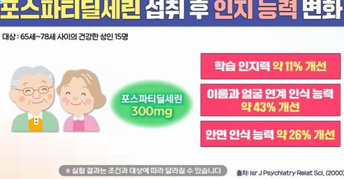 연구에 따르면, 65~78세 사이의 건강한 성인에게 포스파티딜세린 300mg을 섭취하게 하였더니 학습 인지력과 인식 능력이 개선된 것으로 나타났습니다. 이는 포스파티딜세린이 인지 기능 향상에 도움을 줄 수 있다는 것을 보여줍니다.