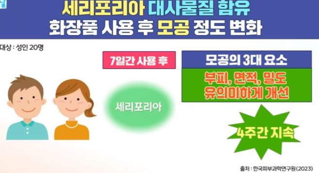 피부 노화와 자외선 자극 등으로 모공이 확장되는 경우가 많으며, 이로 인해 피부의 탄력이 저하되고 잔주름이 생기게 됩니다. 세리포리아 대사물질이 함유된 화장품을 사용한 연구에서 모공의 부피, 면적, 밀도가 유의미하게 개선되는 결과가 확인되었으며, 이는 세리포리아가 모공 확장 개선에 도움을 주는 데 중요한 역할을 한다는 것을 의미합니다.