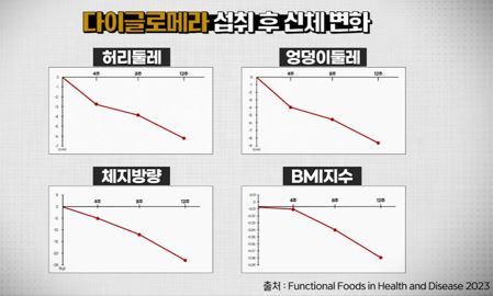 다이글로메라는 체지방 감소와 관련된 다양한 연구 결과가 있습니다. 비만을 유발한 쥐에게 다이글로메라를 공급한 결과, 에너지 대사를 활발하게 만들어주는 AMPK가 최대 2.6배 증가했다는 보고가 있습니다. 또한, 성인을 대상으로 한 연구에서는 12주간 섭취 후 체중이 평균 6.73kg 감소하고, 허리 둘레와 체지방량 등 비만 지표가 개선되었습니다.